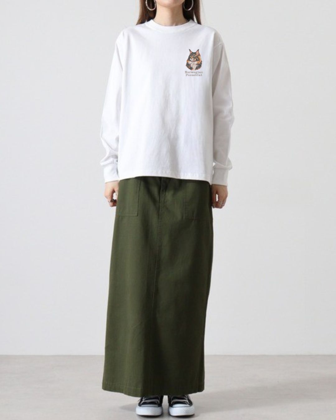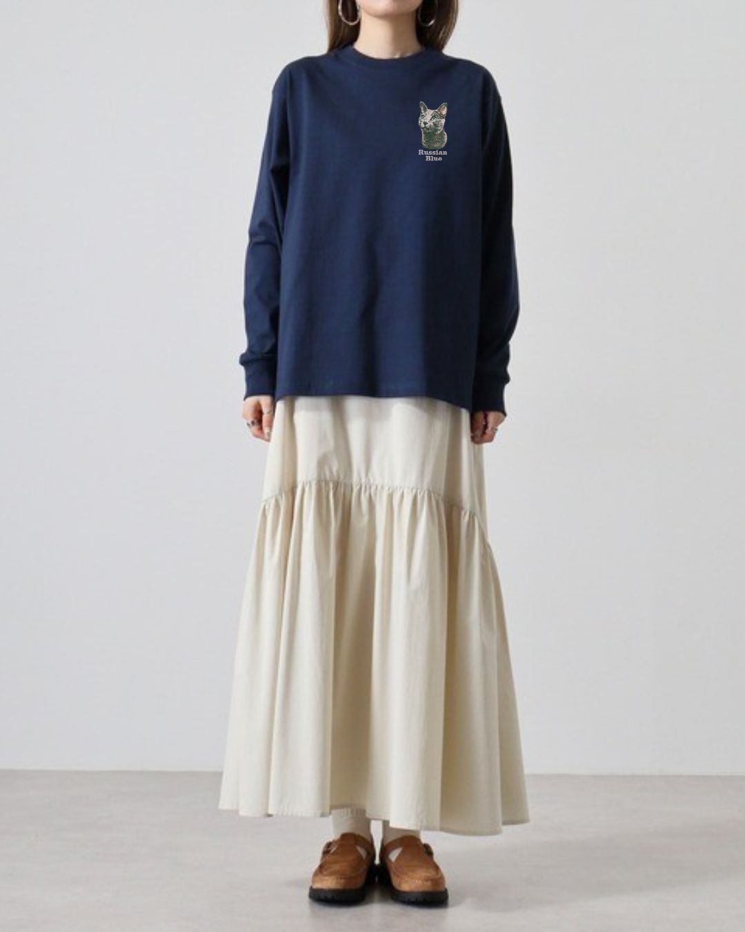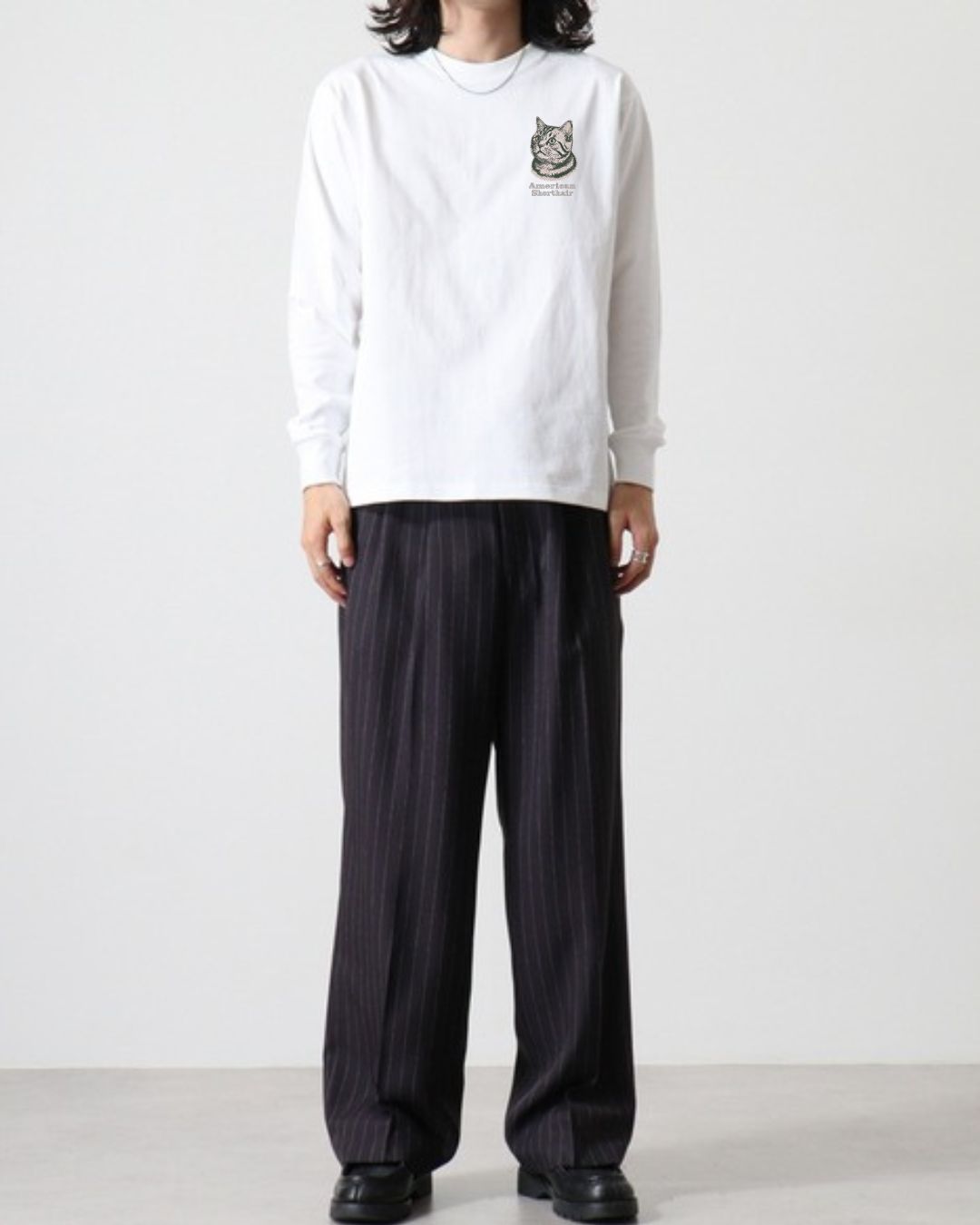USAコットン100%・8.1ozのヘビーウェイト生地を使用した、タフでしっかりとした着心地の猫刺繍ロングTシャツ。透けにくく、洗っても型崩れしにくい耐久性の高さが魅力です。