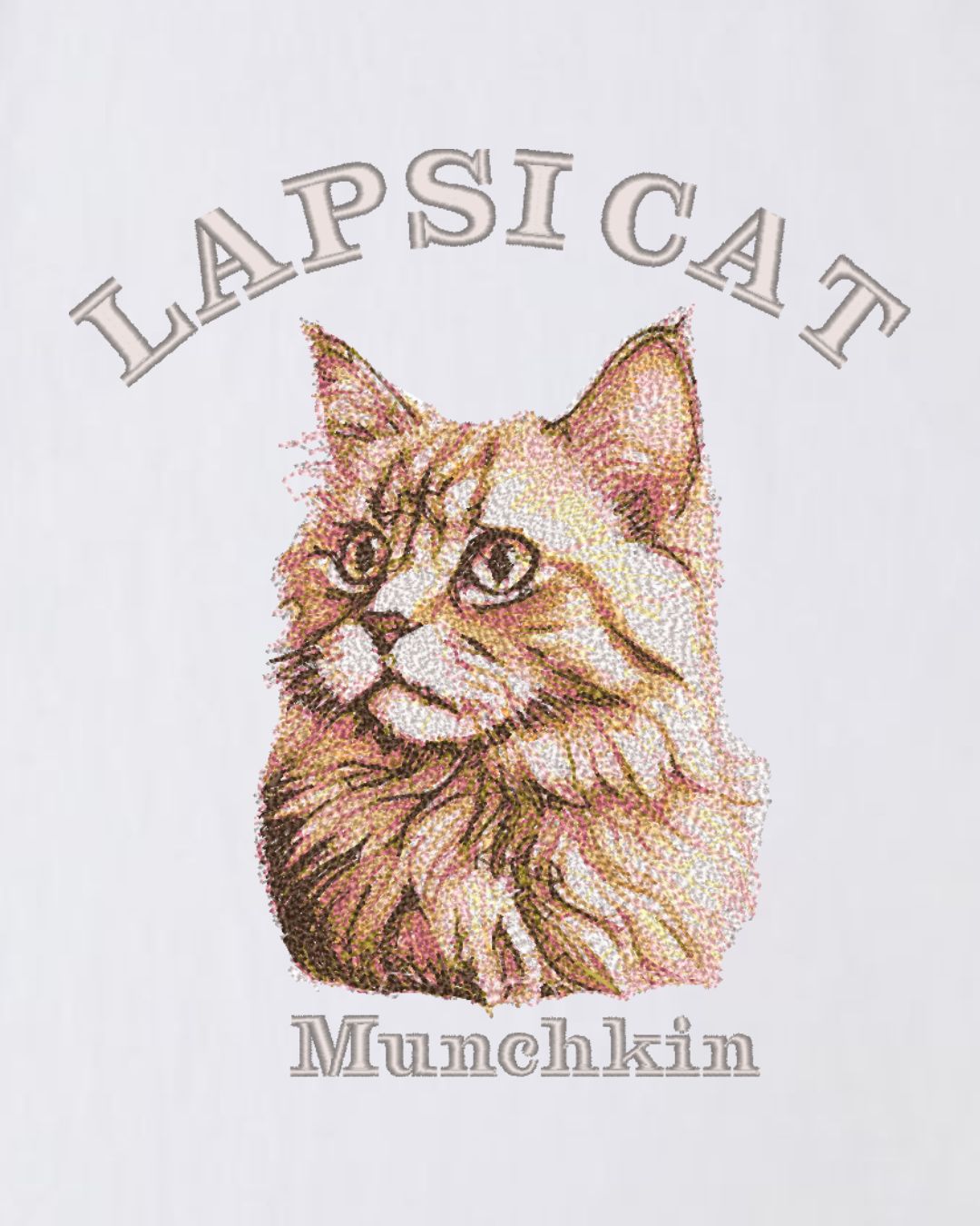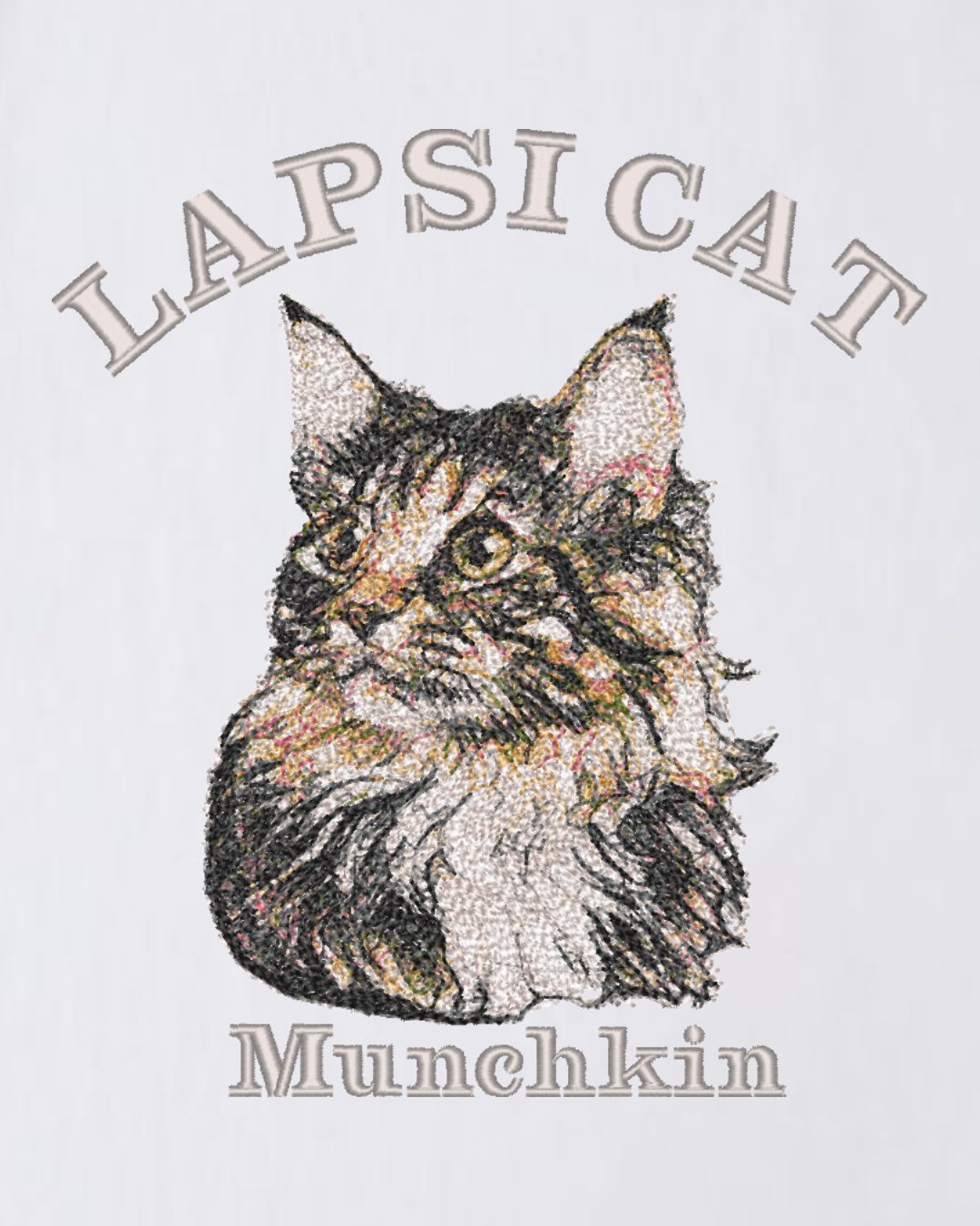 フロントには、リアルなMunchkin(マンチカン )の刺繍を大胆に配置。最大10色・約6万針を用いて毛並みの立体感を細かく表現し、ピンクの差し色を加えることで自然なツヤと奥行きをプラス。刺繍ならではの温もりと存在感が感じられます。