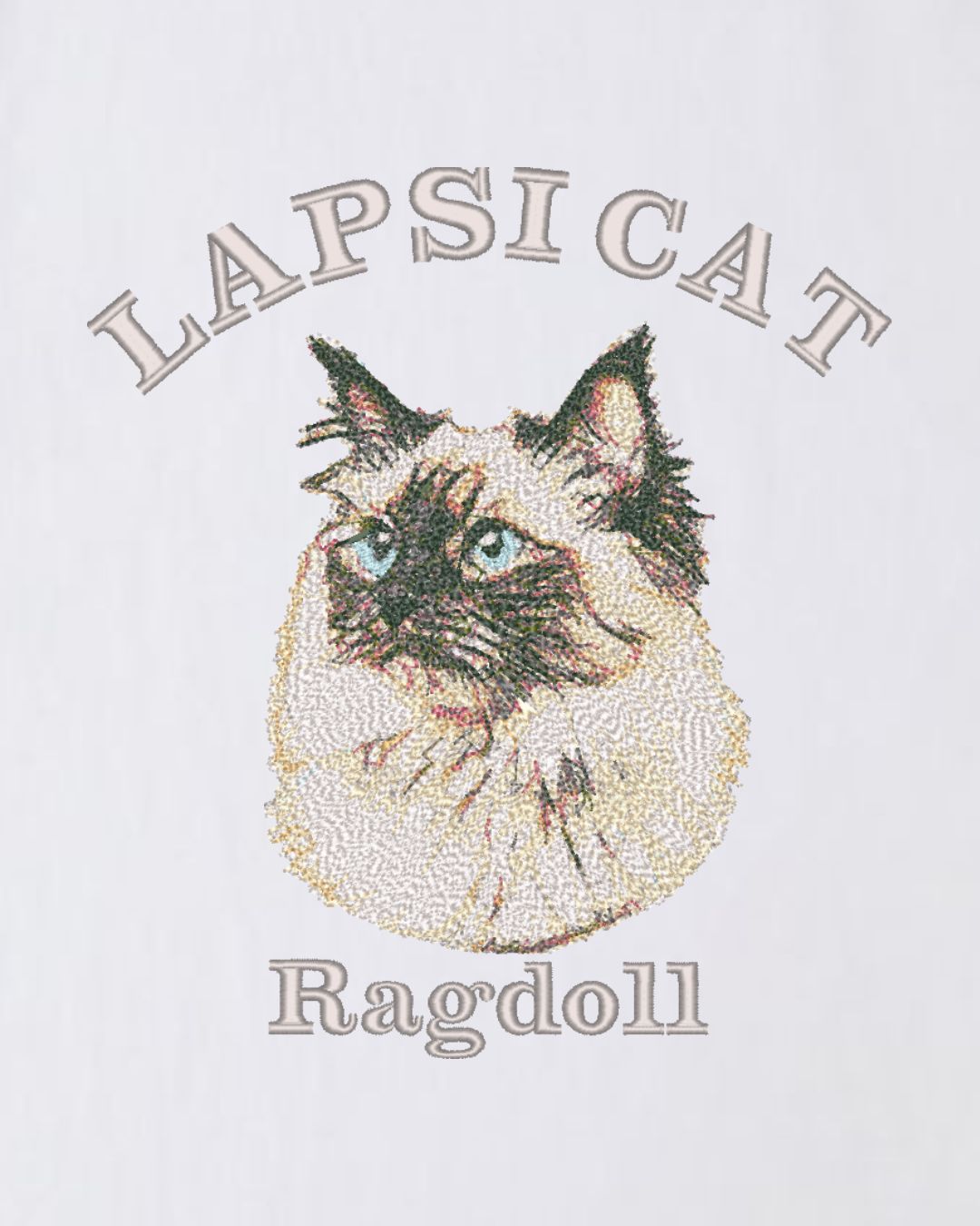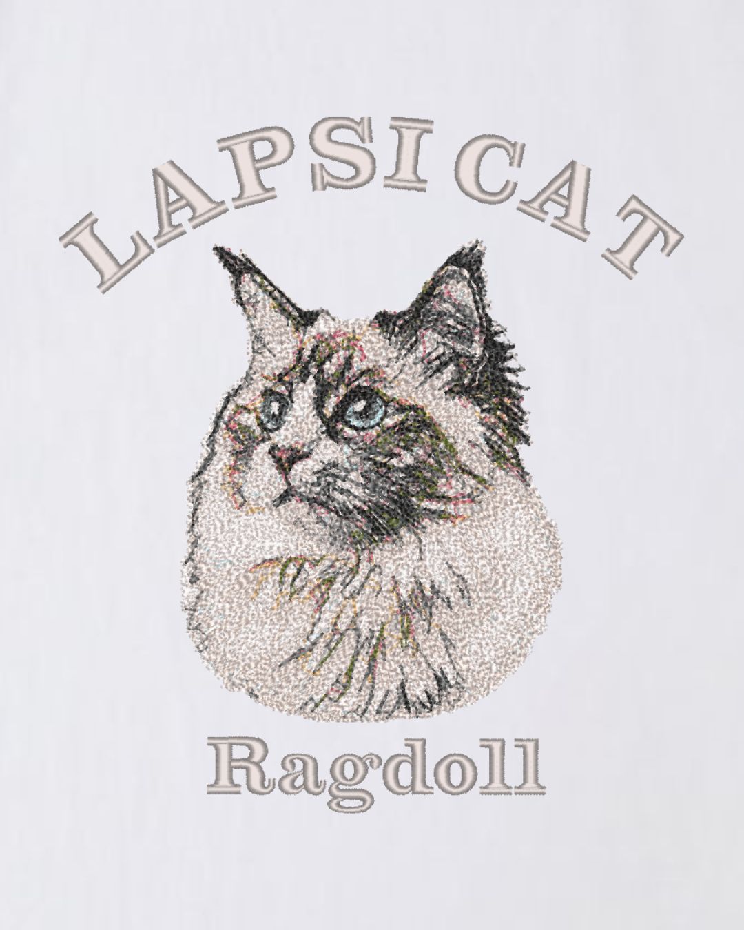 フロントには、リアルなRagdoll(ラグドール)の刺繍を大胆に配置。最大10色・約6万針を用いて毛並みの立体感を細かく表現し、ピンクの差し色を加えることで自然なツヤと奥行きをプラス。刺繍ならではの温もりと存在感が感じられます。
