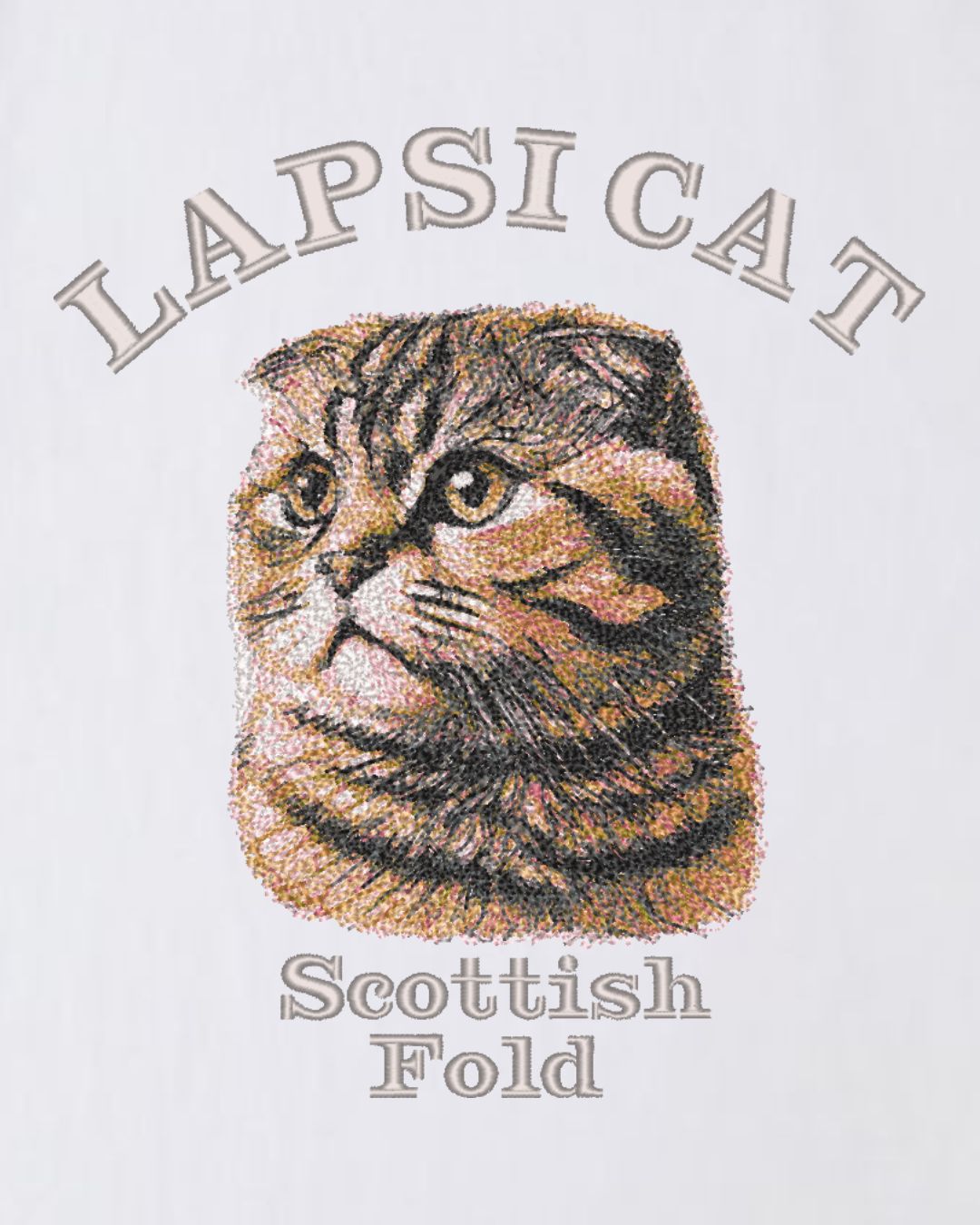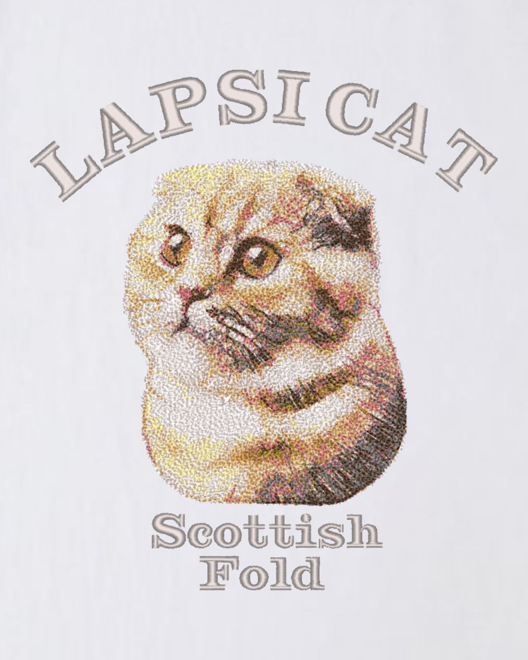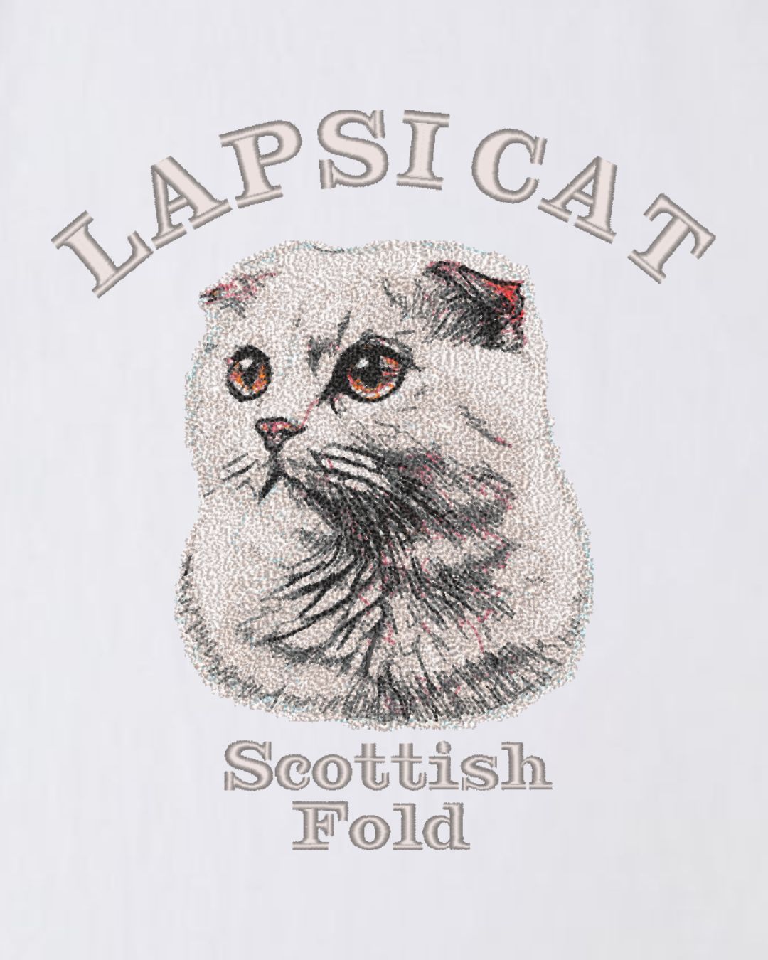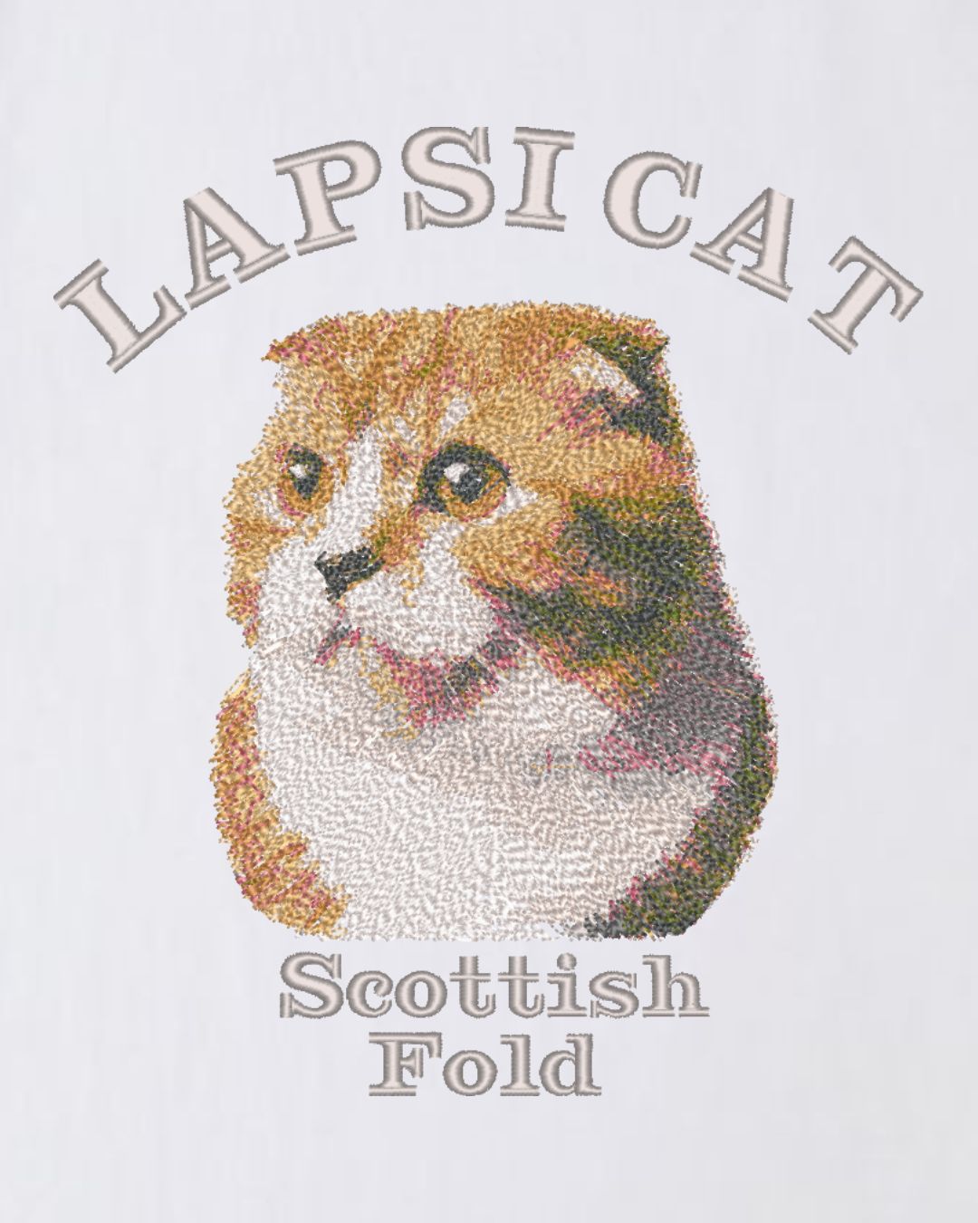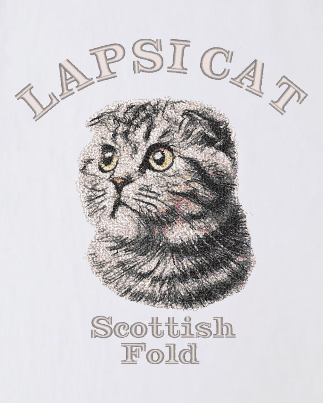 フロントには、リアルなScottish Fold(スコティッシュフォールド)の刺繍を大胆に配置。最大10色・約6万針を用いて毛並みの立体感を細かく表現し、ピンクの差し色を加えることで自然なツヤと奥行きをプラス。刺繍ならではの温もりと存在感が感じられます。