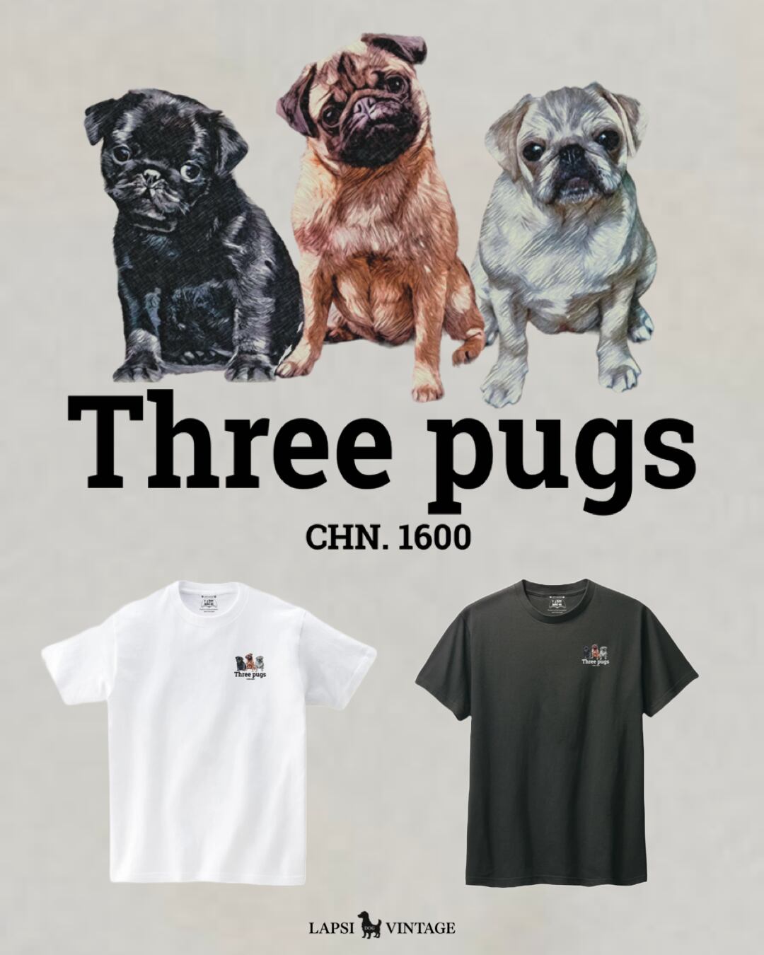【Three Pugs】は、ブラック、フォーン、ホワイトなどのカラーバリエーションでバランスを大切にしつつ、それぞれの犬の個性を表情に込めました。