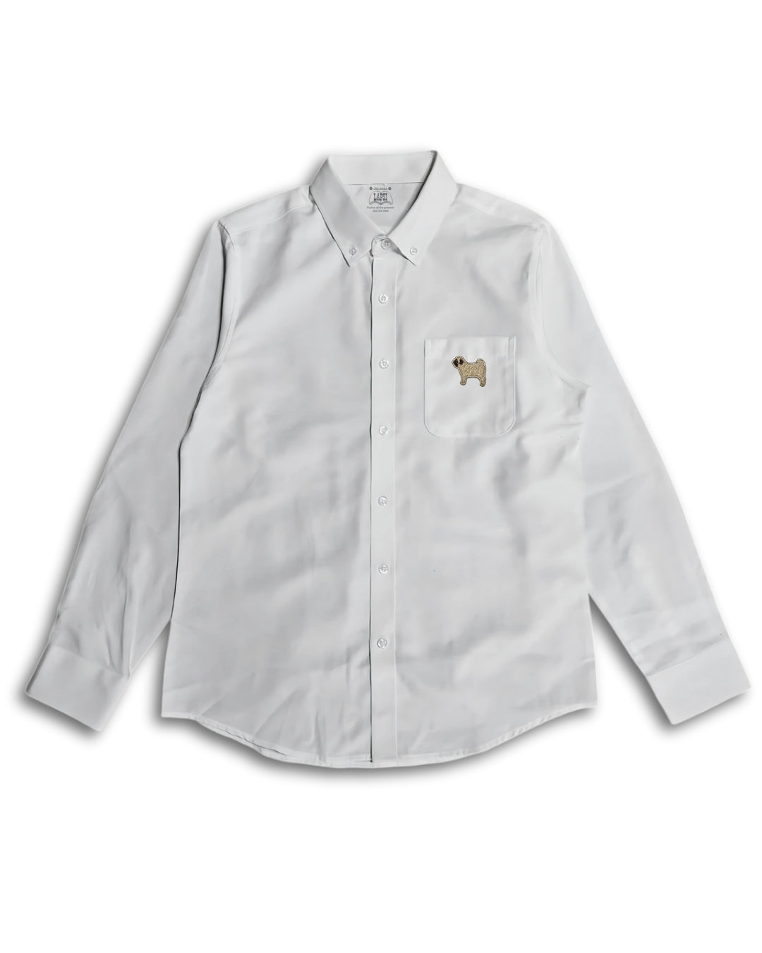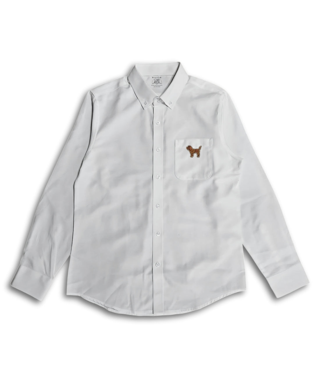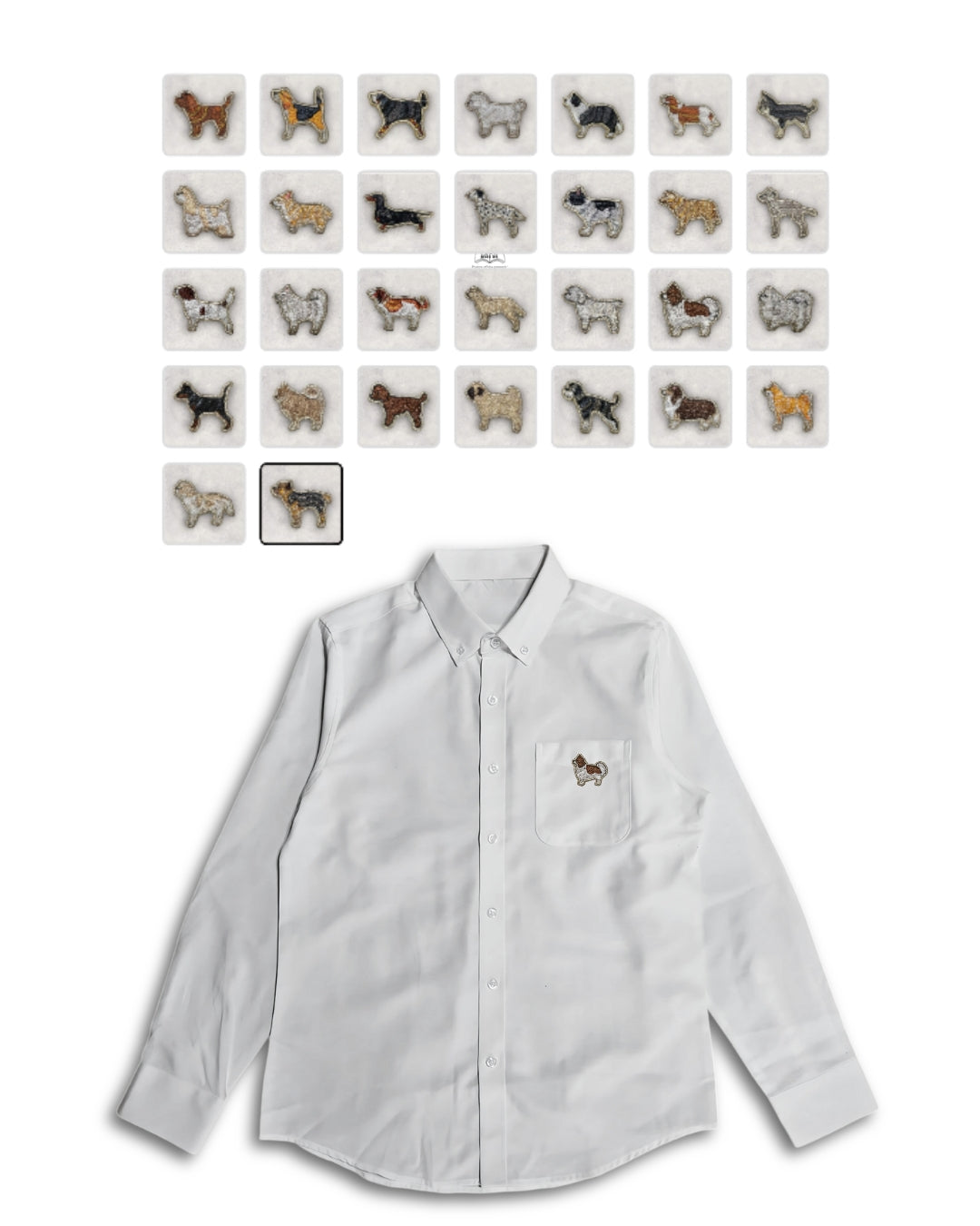 コットンとポリエステルの混合生地に、選べるリアルな犬の刺繍。刺繍は1950年代の犬モチーフを再現。クラシックで懐かしい雰囲気が魅力です。4000本の糸と8色以上で、毛並みのグラデーションまで鮮やかに表現。あなただけの白シャツを。
