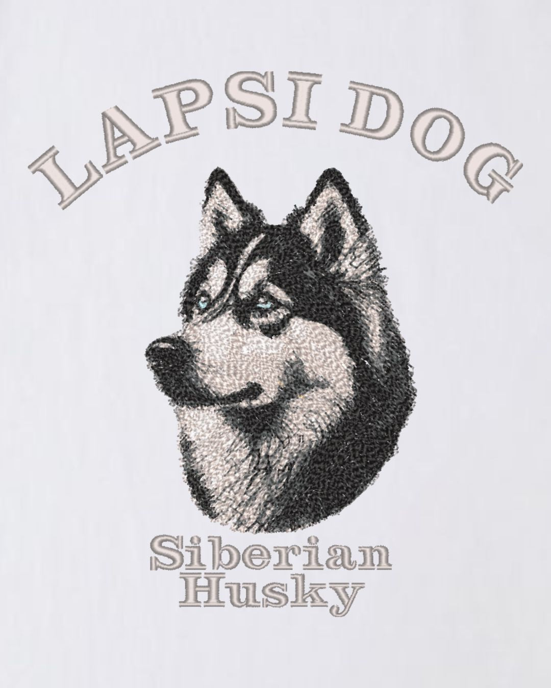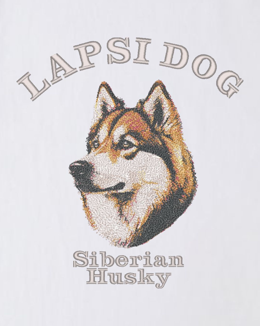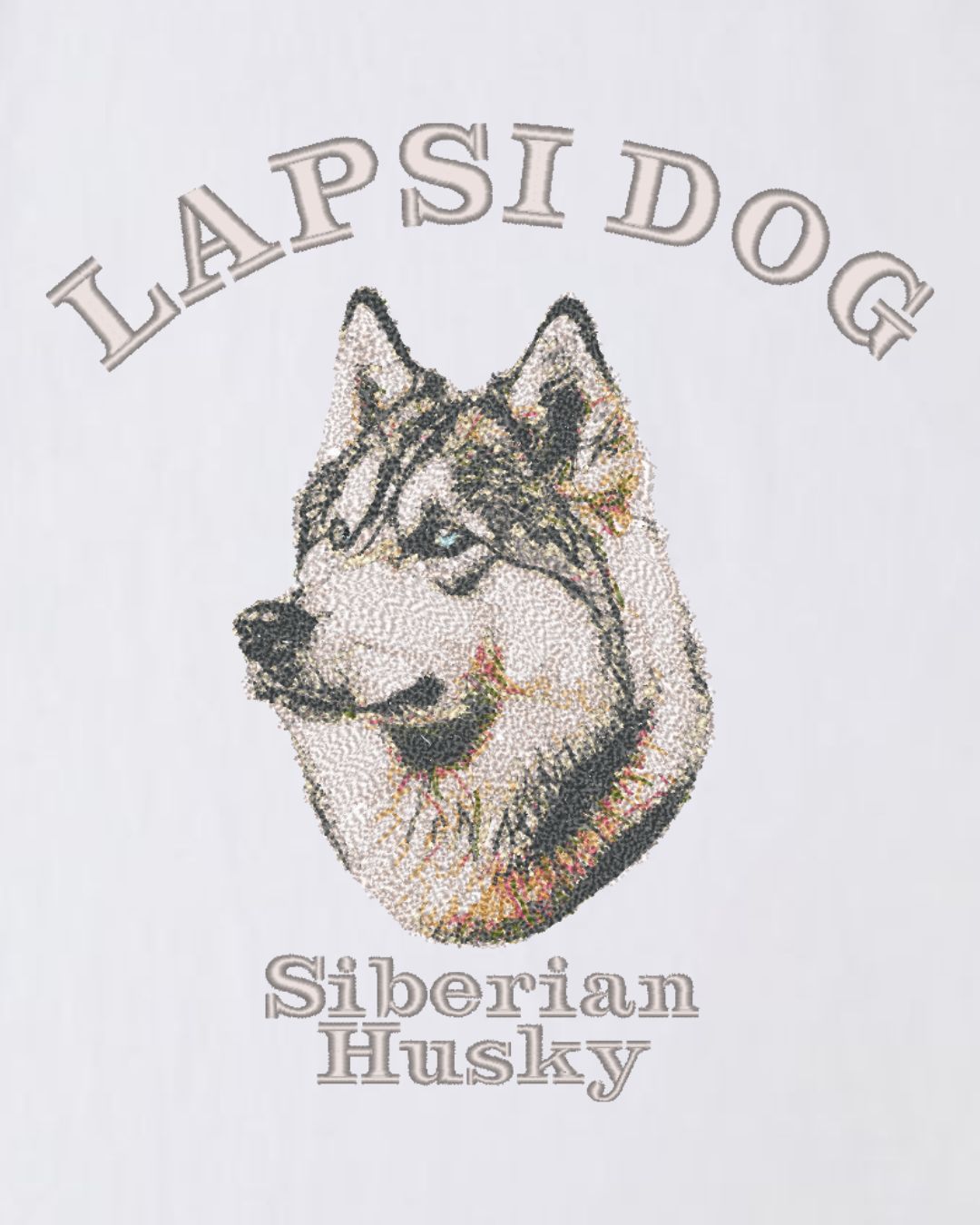 フロントには、リアルなシベリアンハスキー( Siberian Husky)の刺繍を大胆に配置。最大10色・約6万針を用いて毛並みの立体感を細かく表現し、ピンクの差し色を加えることで自然なツヤと奥行きをプラス。刺繍ならではの温もりと存在感が感じられます。