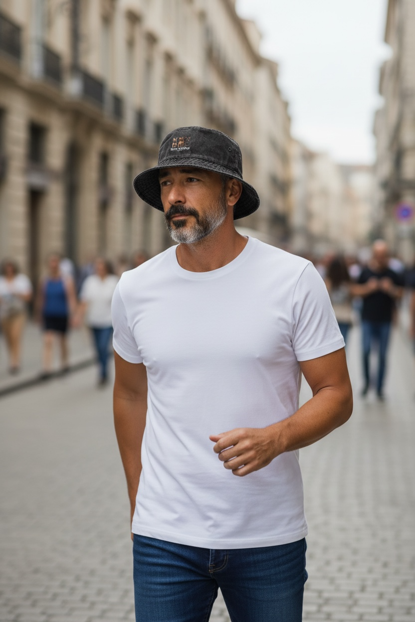 このコットンデニム素材のバケットハットは、適度なウォッシュ加工が施され、柔らかさとオールシーズンの着用が可能です。
